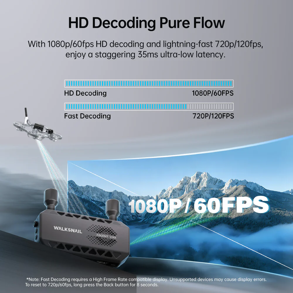 Equipped with a powerful core, the VRX supports 1080P/60fps HD decoding and high-frame-rate 720P/120fps fast decoding. It ensures a clear, smooth, lag-free image, maintaining your absolute edge in high-speed and competitive flight.