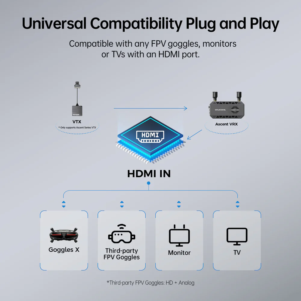 Compatible with any FPV goggles, monitors, or TVs with an HDMI port. True plug-and-play support makes multi-screen viewing easy for training, sharing, or race broadcasting.